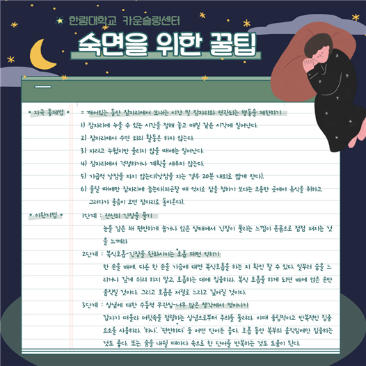 카운슬링센터 외에 도움을 받을 수 있는 정신건강 관련 기관과 스트레스를 다루는 방법과 숙면을 위한 가이드를 보내니아래 내용을 참고하여 즐겁고 의미 있는 여름 방학을 보내기 바랍니다.