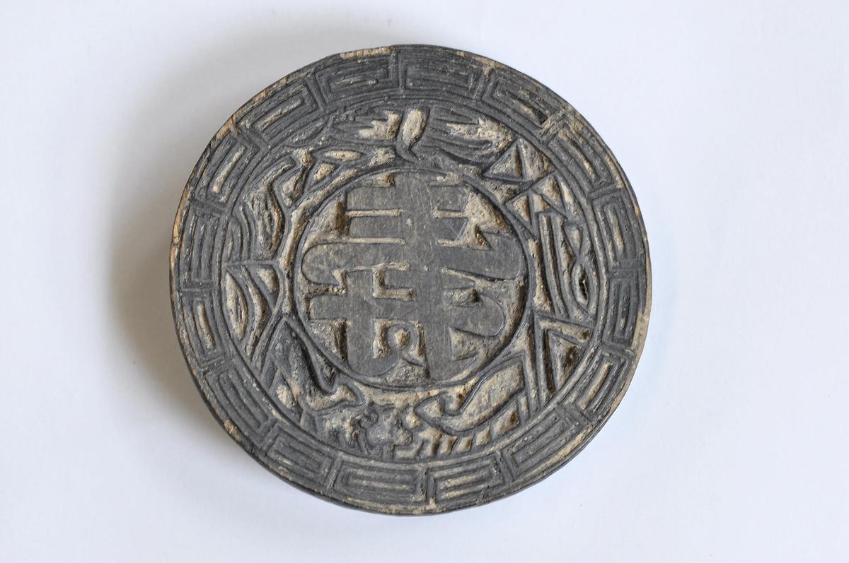이 베갯모판은 중심부에는 목숨 수(壽)라는 한자를 도안화하여 새기고, 중간의 둥근 부분에는 사슴, 불로초, 학, 물결 등 십장생(十長生, 열 가지 오래 사는 것)무늬를 새겨 장수를 바라는 마음을 표현하였습니다. 또한 곡두무늬(번개무늬)를 테두리에 두르며 새겨 가장자리를 장식하였습니다.
