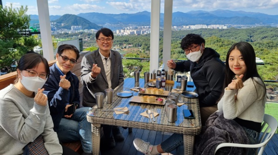 ▲  정치행정학과 정용남 교수, 박병직 겸임교수, 춘청춘 팀(정치행정학과 윤정태 학생 포함)