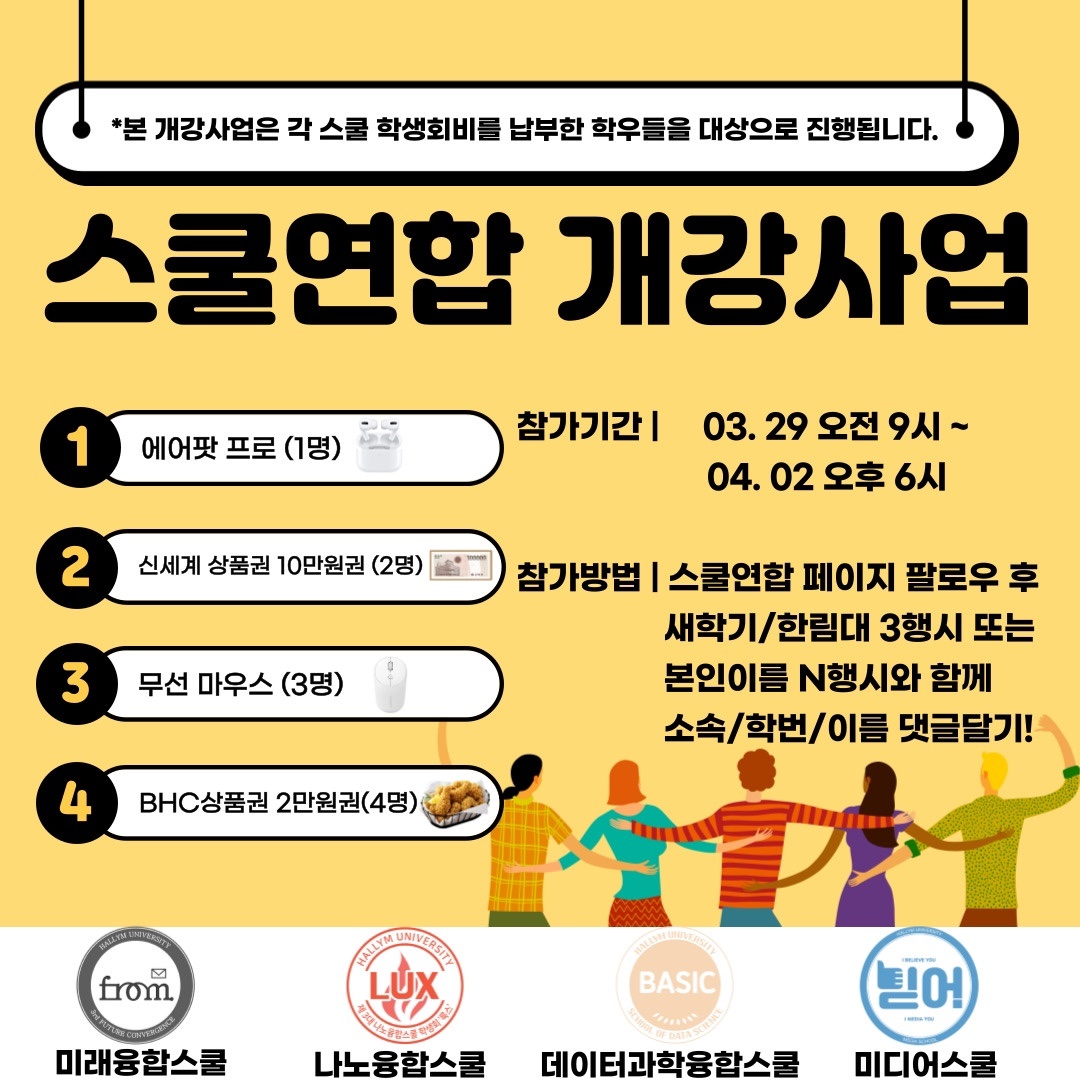 4개의 스쿨이 모여 개강사업을 진행하며, 스쿨연합을 소개하고 개강을 축하하는 행사를 진행했습니다.